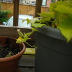 July 7, 2009January 10, 2017 | Emily June 28th – Potluck Cucumber. Tiny cucumber forming – yellow flowers. Saw some cucumber beetles (yellow & black stripes) but managed to squish a few. Note sallow yellow color of plant pre-fertilizer.